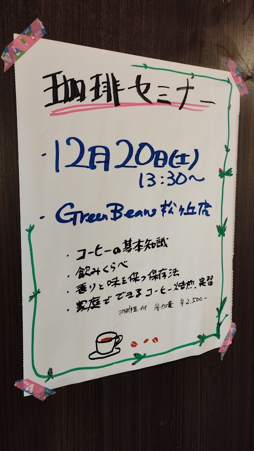 12/20珈琲セミナー開催 12月20日珈琲セミナー開催します。 珈琲の基礎知識の学習、飲み比べ、おいしい淹れ方、珈琲豆の保存方法を学び、家庭でできる珈琲豆の焙煎実習を行います。 ・12月20日(土)13:30~ ・会場 GreenBeans松ヶ丘店(和歌山市松ヶ丘1-1-35) ・会費 2500円(珈琲豆100g付き) ・問合せ・申込 スタッフまたは☏073-488-3884
