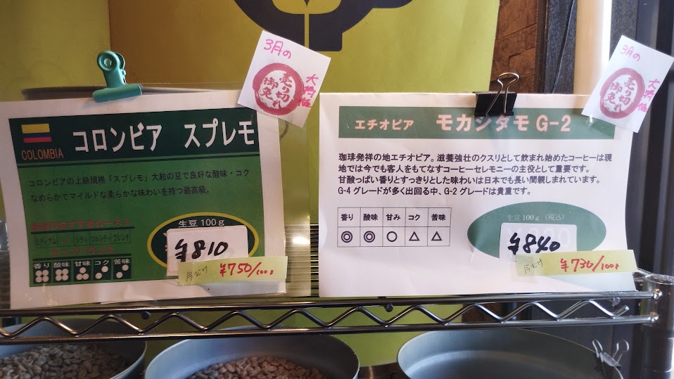 今月の大特価は、コロンビアスプレモ(通常810円)を730円/100g。